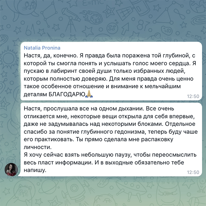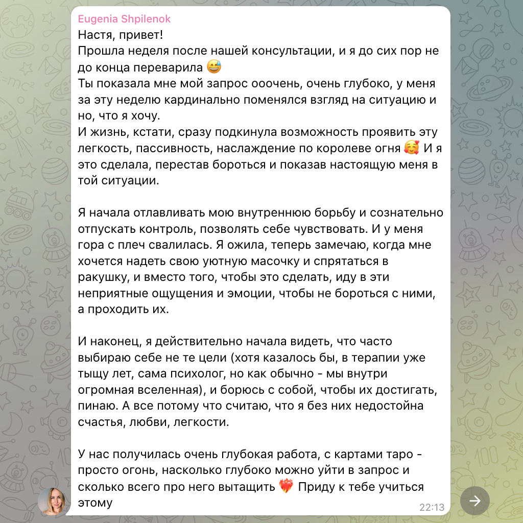 Я даю системное знание и понимание, как все устроено и что делать - самое частое, что я слышу: "Почему мой психолог/коуч не мог мне это объяснить также доступно?".