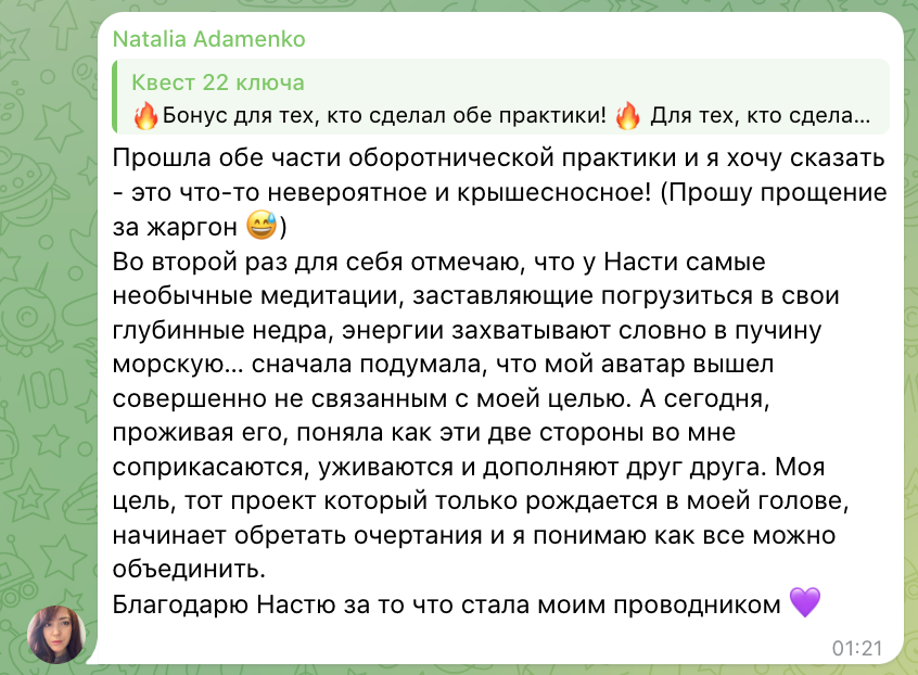 Подробный маршрут квеста: Ключ "Шут" - контакт со своим внутренним ребенком и самостью, со своим ключевым состоянием силы. Разрешать себе мечтать и желать. Постановка целей. Ключ «Маг» - контакт с мужской энергией и мужским принципом. Способностью сталкиваться и преодолевать трудности. Агрессия и аутоагрессия. Ключ «Верховная жрица» - контакт с женской энергией и способностью адаптироваться, проходить трансформацию, быть в контакте с внутренним центром, слышать свои собственные потребности и желания и при этом не быть в борьбе, против мира. Ключ «Императрицы» - контакт с неисчерпаемым источником, из которого все время рождается новое. Способность к творчеству, бурный рост и циклическое обновление. Архетип Матери. Ключ "Император" - контакт с архетипом Отца (мужская харизма) и опыт, связанный с отцовским началом: авторитетом, руководством, силой, властью порядка и права (отец, муж). Маскулинность как таковая, земная мужская оплодотворяющая сила, настойчивость и храбрость, компетентность и твердость. Ключ "Жрец" - контроль или адаптация? Снятие родительских оков, избавление от негативных родительских установок. Прорабатываем страх негативной оценки. Работаем с нашими учителями и учимся брать ответственность на себя. Ключ "Влюбленные" - выбор сердцем, выбор себя и своего пути. Как отделять свои и не свои желания, как на нас влияют значимые люди, как среди этих голосов и влияний слышать себя и идти за своими импульсами и потребностями. Ключ "Колесница" - достоинство и зрелость. Как освободиться от влияния голода (голодного эгоистичного ребенка внутри нас) и при этом не попасть под влияние социального внешнего одобрения, где нужно вечно что-то доказывать, чтобы кто-то позавидовал, оценил, признал. Ключ "Справедливость" - долги перед собой. Исследуем как возвращать долги себе, создаем опыт взаимообмена энергии в социуме. Ключ "Отшельник" - предназначение, тз от Бога. Это кульминация того, что мы о себе думаем, чего хотим, что мы транслируем в этот мир. Ключ "Колесо Фортуны" - баланс везения и приложения собственных усилий. Как выйти в программу везения и больших возможностей. Ключ "Сила" - контакт со своей Силой. Чем Сила отличается от насилия, открываем и присваиваем персональное состояние внутренней силы. Ключ "Повешенный" - столкновение с кризисом. Учимся осознанно жертвовать, выходим из затянувшегося периода и подвешенного состояния. Способность находить ресурсы, чтобы проходить важные кризисные этапы в жизни. Ключ "Смерть" - трансформация. Проживаем цикличность: любой конец - это всегда новое начало. Прорабатываем внутреннюю готовность к переменам. Ключ "Умеренность" - контакт со своей сексуальностью (энергией жизни). Обретаем внутренний баланс мужского и женского. Ключ "Дьявол" - Эго, гордость, гордыня, работа с тенью. Осознаем и принимаем свою "темную" сторону, берем ее под контроль. Ключ "Башня" - работа с тревогой разрушения иллюзий, освобождение от внутренних оков, возвращение к целостности. Ключ "Звезда" - контакт с голосом души. Работаем с тревогой о невозможности найти свое предназначение. Идем ли мы тем Путем? Прорабатываем способность принимать Ключ "Луна" - иллюзии семейной системы. Освобождаемся от родовых программ и деструктивных паттернов. Обретаем зрелость и глубинное знание себя. Ключ "Солнце" - освобождение. Обретаем принятие жиз