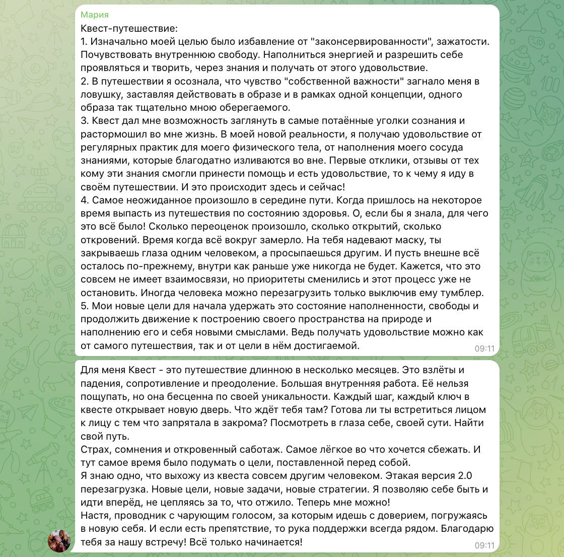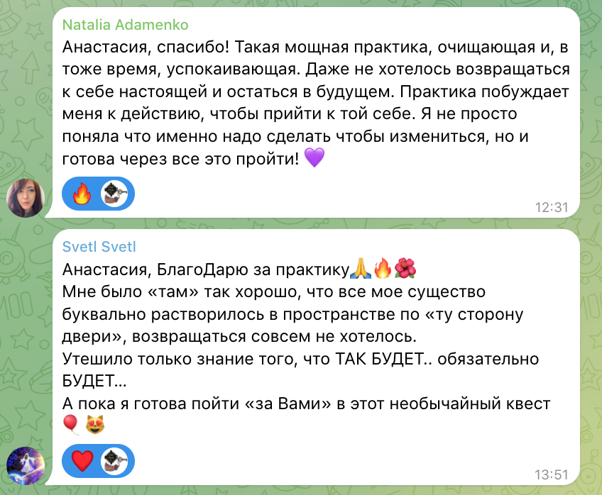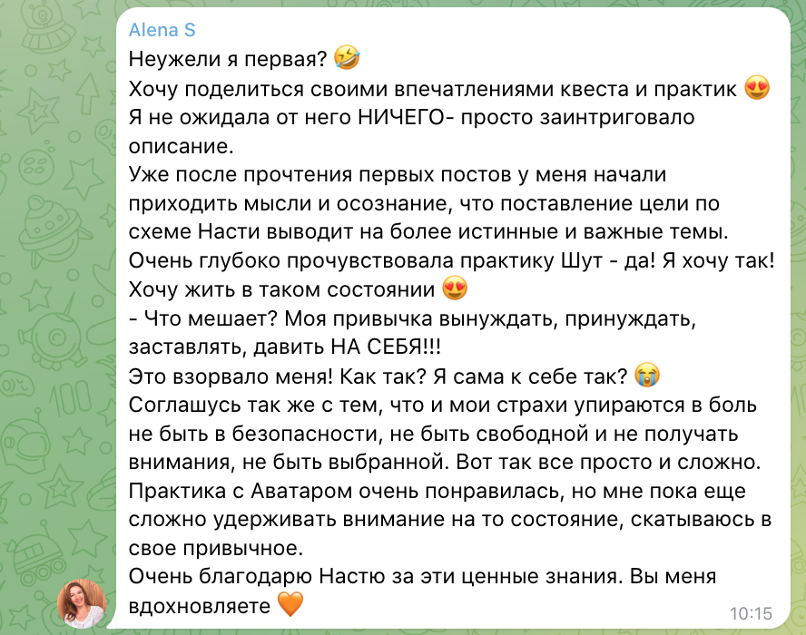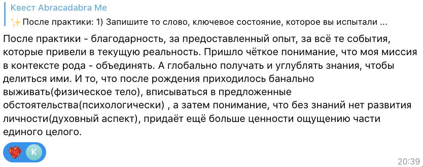 Одна неделя квеста - это один уровень, при прохождении которого вы получаете ключ-состояние: технически это включает в себя мини-лекцию, терапевтическую трансформационную практику, задания.