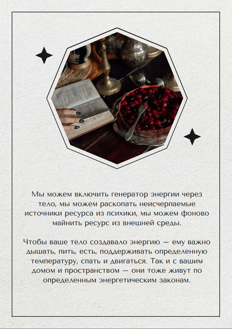 Мы можем включить генератор энергии через тело, мы можем раскопать неичерпаемые источники ресурса из психики, мы можем фоново майнить ресурс из внешней среды - из любого пространства, и особенно - из вашего дома!